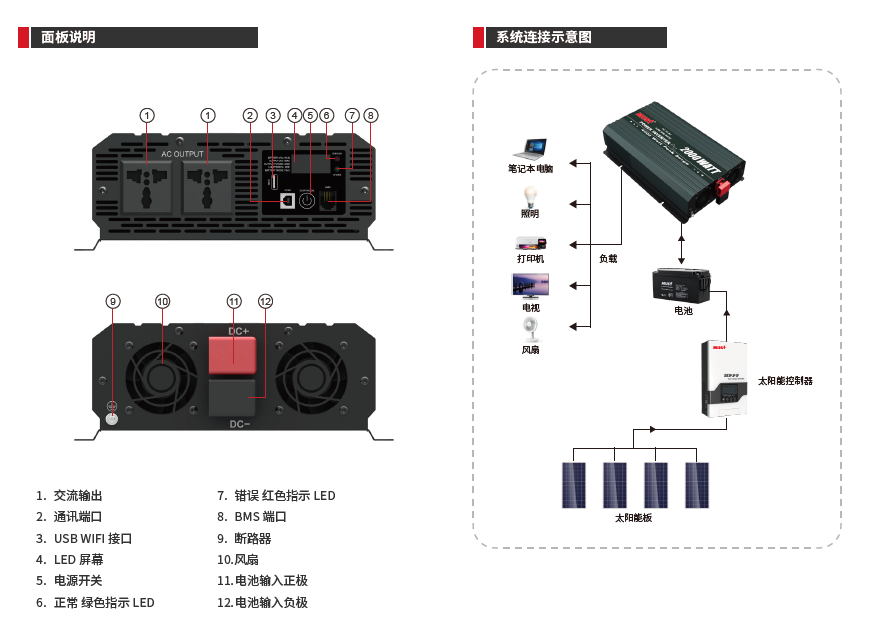 - 具有多模式設置功能,可通過 LCD 屏選擇設置光伏、市電、電池的優先等級